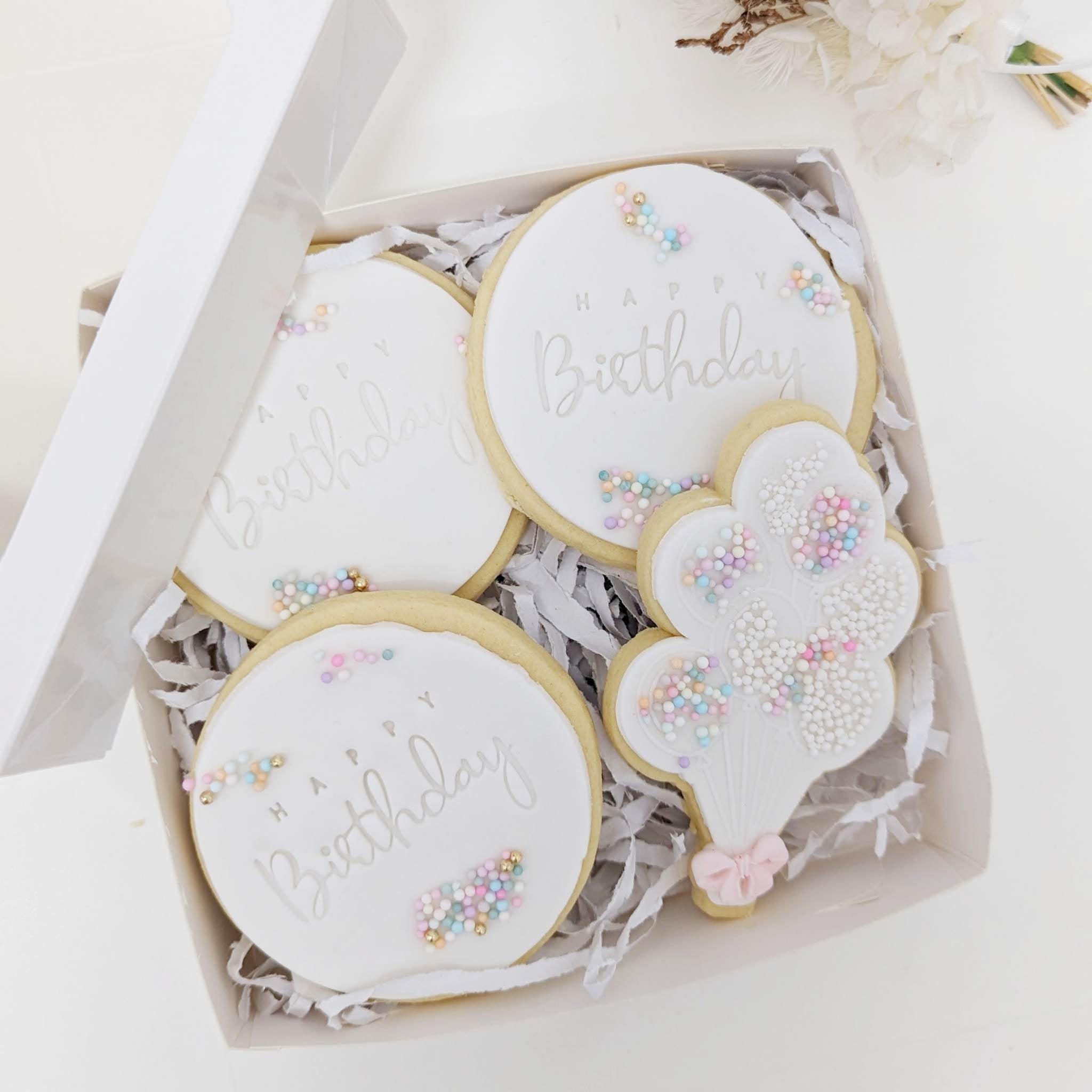 Spoil them with this beautifully hand-decorated cookie gift pack! This pack contains 4 x birthday themed vanilla sugar cookies.