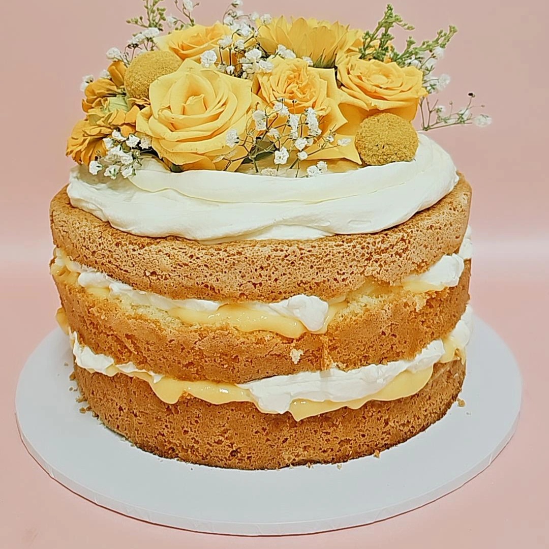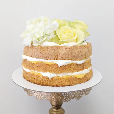 Sky-high light as a feather sponge cake with lemon curd, vanilla chantilly, decorated with fresh lemon curd & optional seasonal flowers to match.