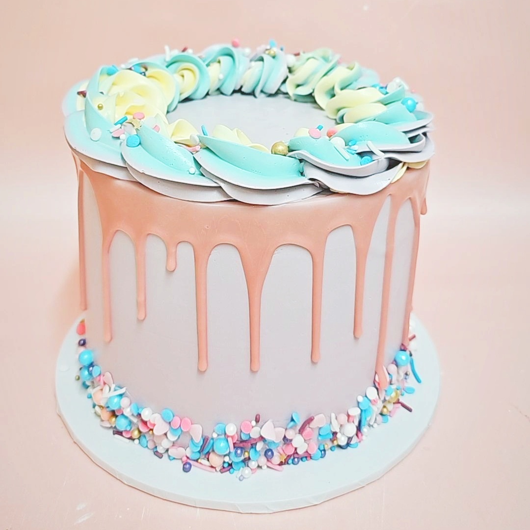 A true celebration cake inside and out! Our rainbow cake is made of our vanilla cake filled with vanilla mascarpone cream. Decorated with swiss meringue buttercream icing pink drip and decorated with rainbow sprinkles.