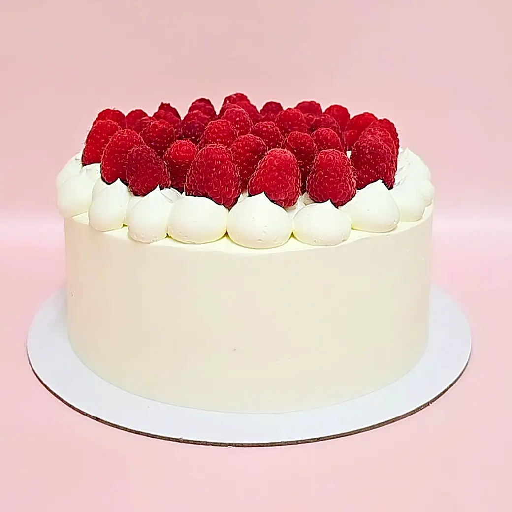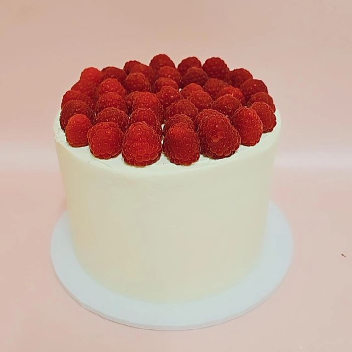 Layered vanilla cake with freeze dried raspberries filled with raspberry jam and mascarpone filling topped with fresh raspberries. A true summer pleaser!