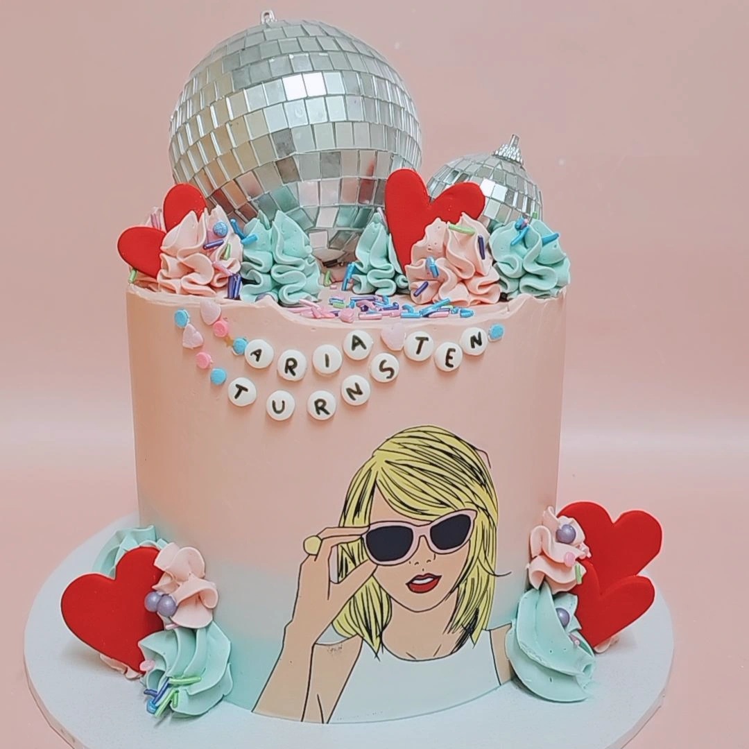 Shake it off and celebrate in style with this delightful cake, wrapped in luscious buttercream icing and adorned with all things Taylor Swift! The perfect cake for any Swiftie. Topped with beautiful, delicate decorations, this cake is as sweet and unforgettable as a Taylor hit!