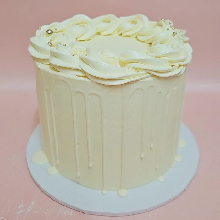 Our signature vanilla cake with mascarpone cream filling and decorated with swiss meringue buttercream, white chocolate drip and gold cachous.